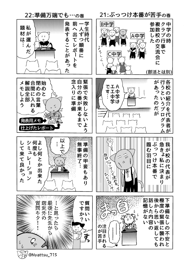 あがり症の苦い思い出を4コマ漫画にしてみた。人前で話すのが苦手。それが更に「ぶっつけ本番」だと緊張もMAXで大失敗。また緊張で失敗したくないので、シミュレーションしまくる私。準備万端にすると少しマシになる。
