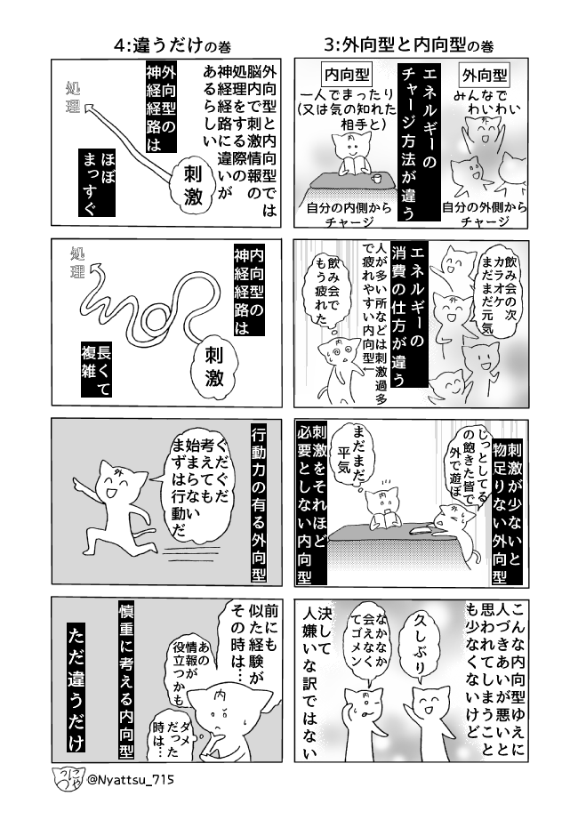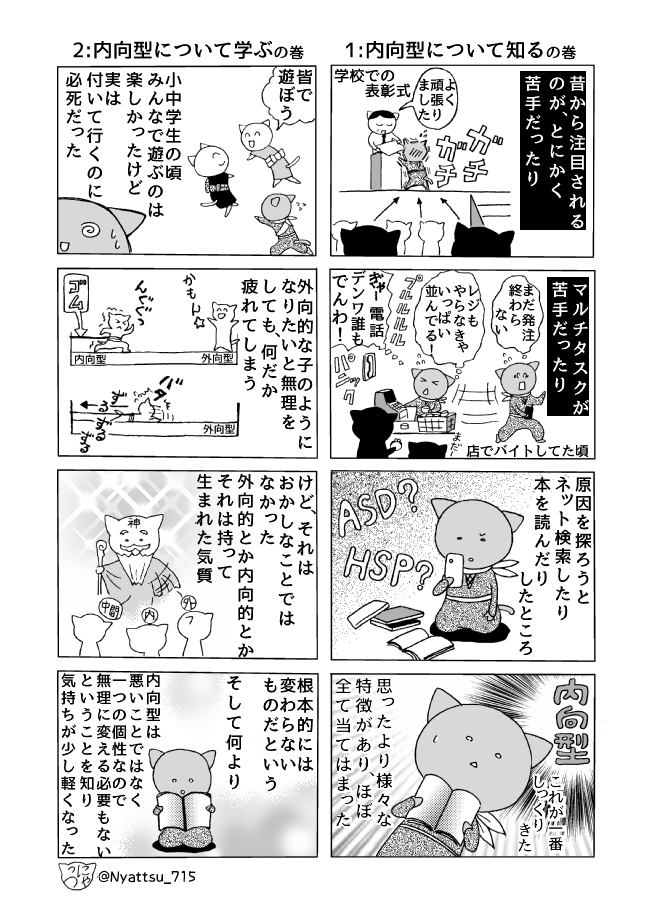 内向型のことを知り、自分もそうだったんだと解った時、気持ちが軽くなった気がした。外交的になろうとしても疲れるだけ。内向型は悪いことではなく「無理しなくて良いのだ」と気付けて前向きになれたと思う。