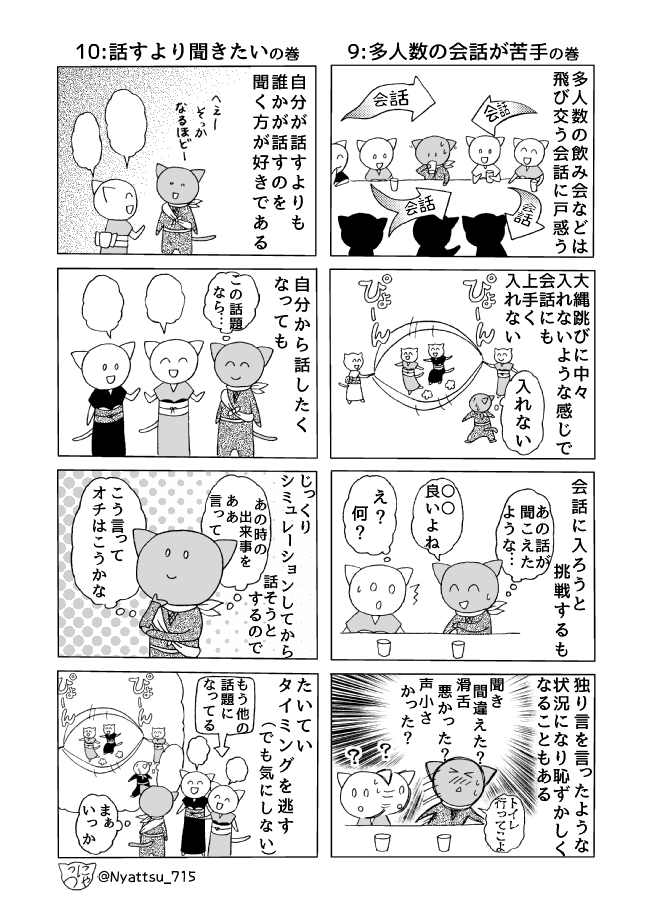 聴覚過敏のせいか多人数の会話が、上手く聞き取れなくて苦手。会話は自分から話すより誰かの話を聞く方が好き。そして友達と会った後は一人反省会が始まる。