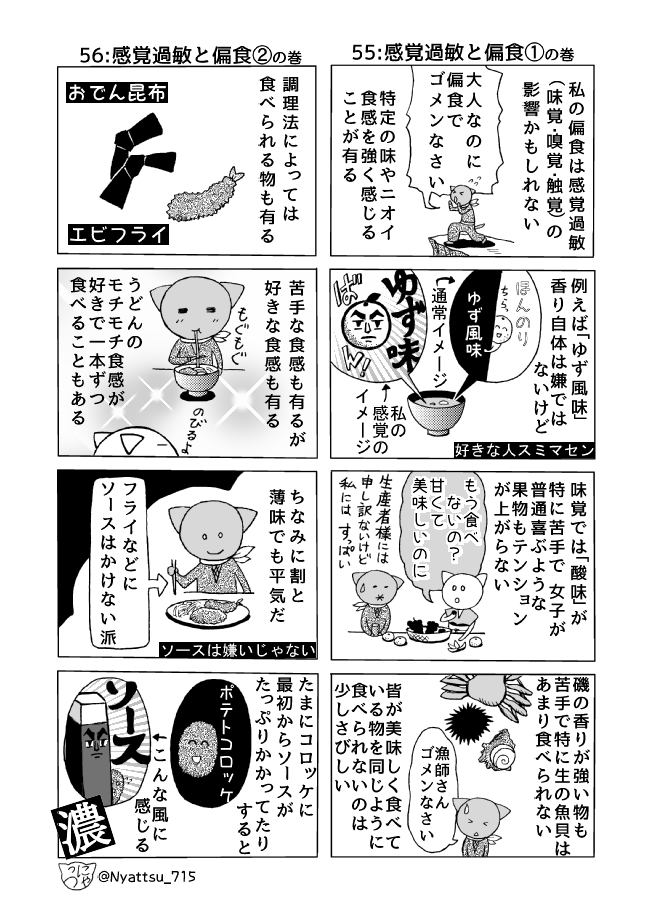 自分は大人なのに偏食で情けないと思ってたけど、感覚過敏の影響も有るかもしれない。環境によって好みは変わるかもしれないけど…。「ただ味が嫌い」とは違う偏食も有る。味覚過敏で特定の味を強く感じたり、嗅覚過敏で特定のニオイを強く感じたり、触覚過敏で食感が苦手だったり…。自分の場合の偏食あれこれを漫画にしてみた。