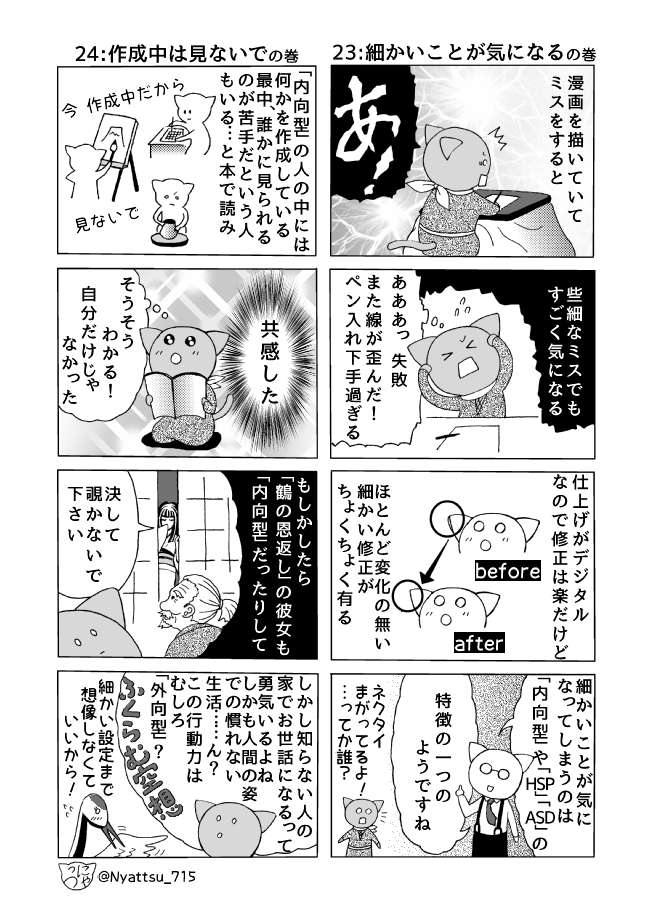 「内向型」「HSP」「感覚過敏」「APD(聴覚情報処理障害)」「ASDグレーゾーン」……「生理痛」「PMS」などの悩みや体験談、思った事や学んだ事などを描いたエッセイ漫画を中心に掲載。 その他、創作漫画やオリジナルイラストなども載せてます。