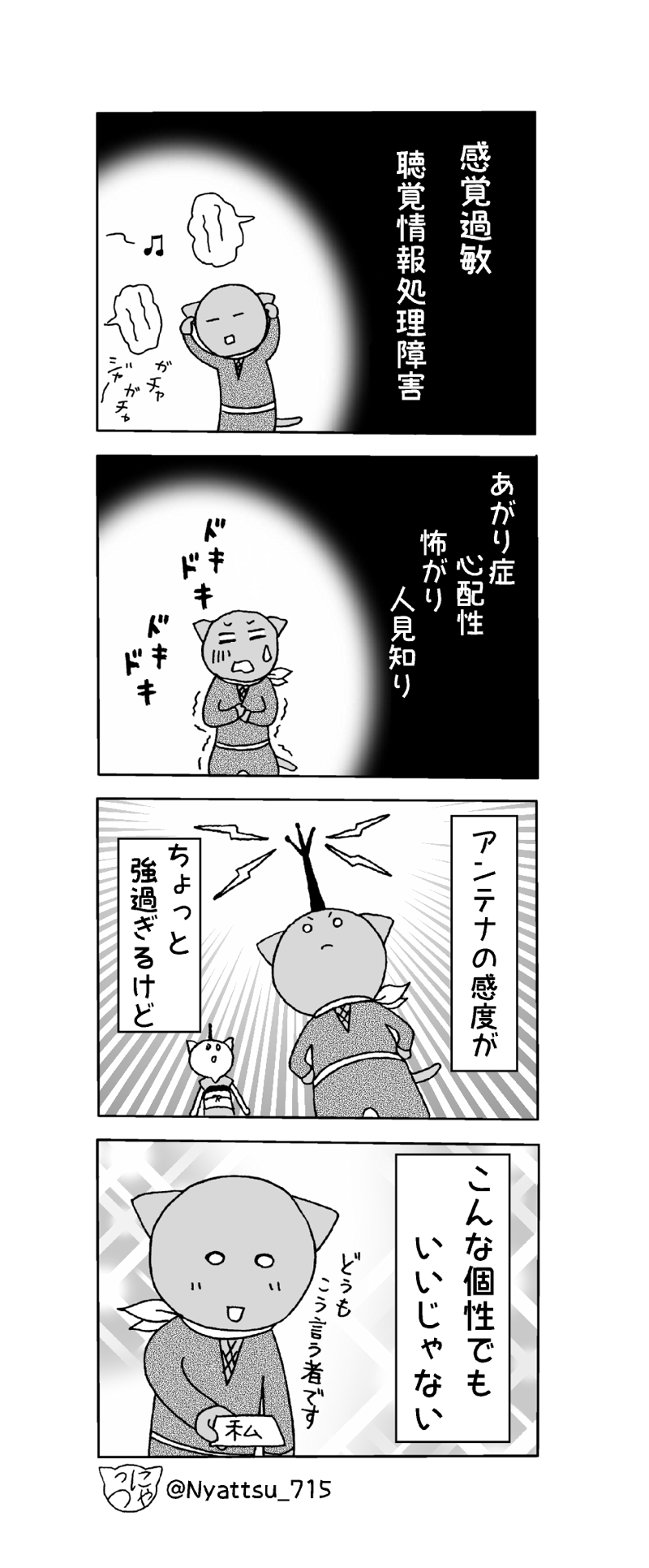 「内向型」「HSP」「感覚過敏」「APD(聴覚情報処理障害)」「ASDグレーゾーン」……「生理痛」「PMS」などの悩みや体験談、思った事や学んだ事などを描いたエッセイ漫画を中心に掲載。 その他、創作漫画やオリジナルイラストなども載せてます。