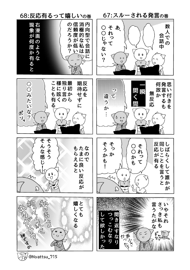 声が小さかったのか。滑舌が悪かったのか。言い方が悪かったのか。タイミングが悪かったのか。会話が噛み合ってなかったのか。面白くなかったのか。私自身の主張が足りなかったのか。普段から会話に消極的だから信頼度が低いのか。嫌われてるのか。反応は期待すべきではないのか。などとぐるぐる考えてしまう。