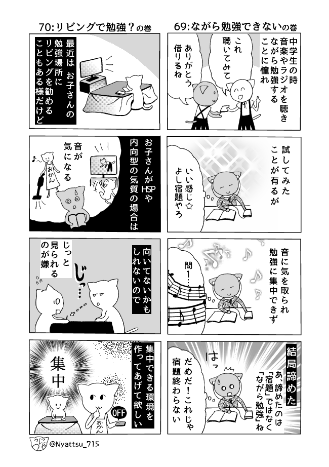 中学生の時、音楽やラジオを聴きながら勉強することに憧れ試してみたけど、音に気を取られ勉強に集中出来ず、結局「ながら勉強」を諦めた思い出…を描いてみた。