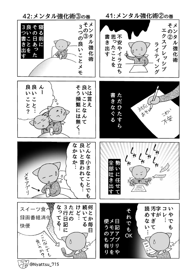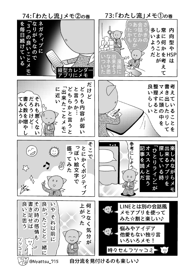 内向型やHSPは常に何かを考えてしまうことが多いようだ。考えていることを書き出したりして、マメに頭の中を整理すると良いらしい。…と言うことで「わたし流」のメモ方を漫画にしてみた。自分はネガティブになり易いので「3つの良いことメモ」も続けている。