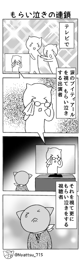 テレビで、涙のVTRを視て もらい泣きをする出演者。それを視て更に もらい泣きする視聴者の私。割とHSPあるあるだと思うけど、どうでしょうか?